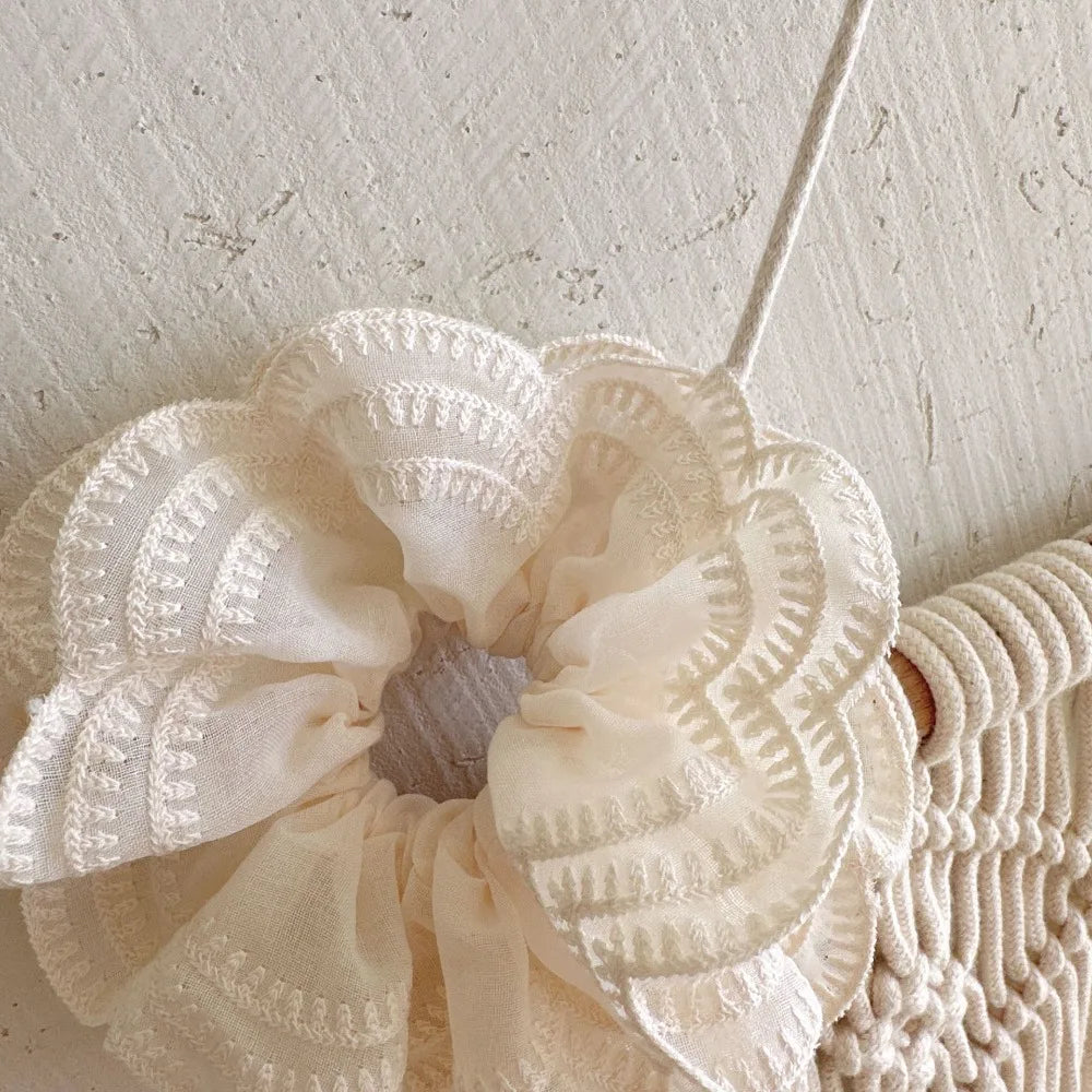 This beautiful antique-style lace scrunchie has a wonderful heirloom feeling to it. Layers of creamy white fabric create volume while the edges feature intricate embroidered lace details. It can be hard to beat a scrunchie for both comfort and hold. Whether you're rocking a top knot, messy bun, or ponytail, add some romance to your style.