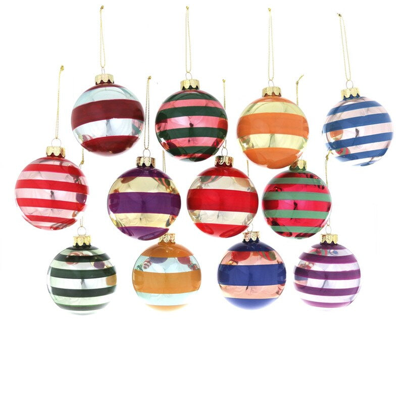 Assorted glass baubles in a range of fun colour combinations, sure to lend a retro feel to your decor!