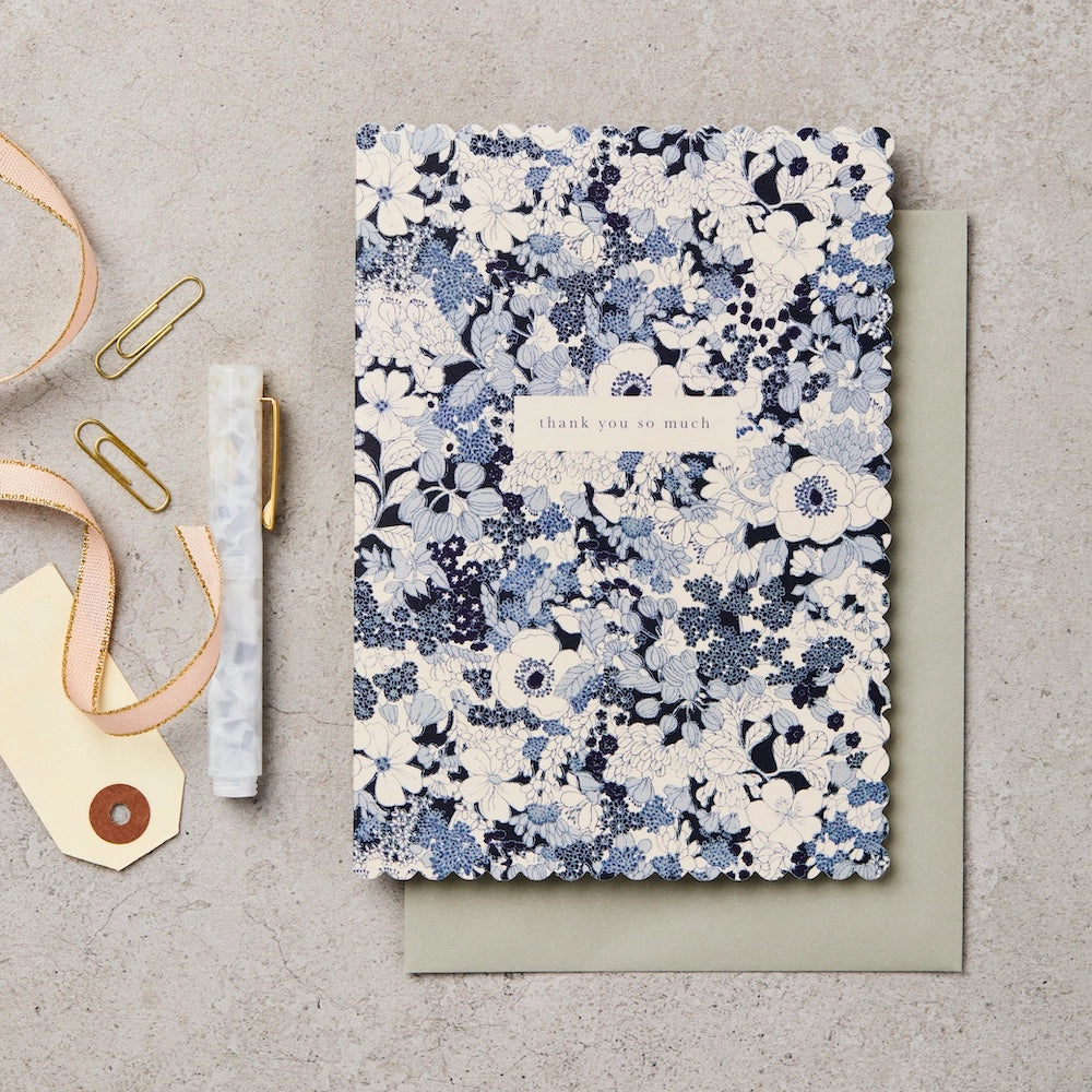 This stunning card features a bold indigo floral print and scalloped edge with a simple "Thank You" message.