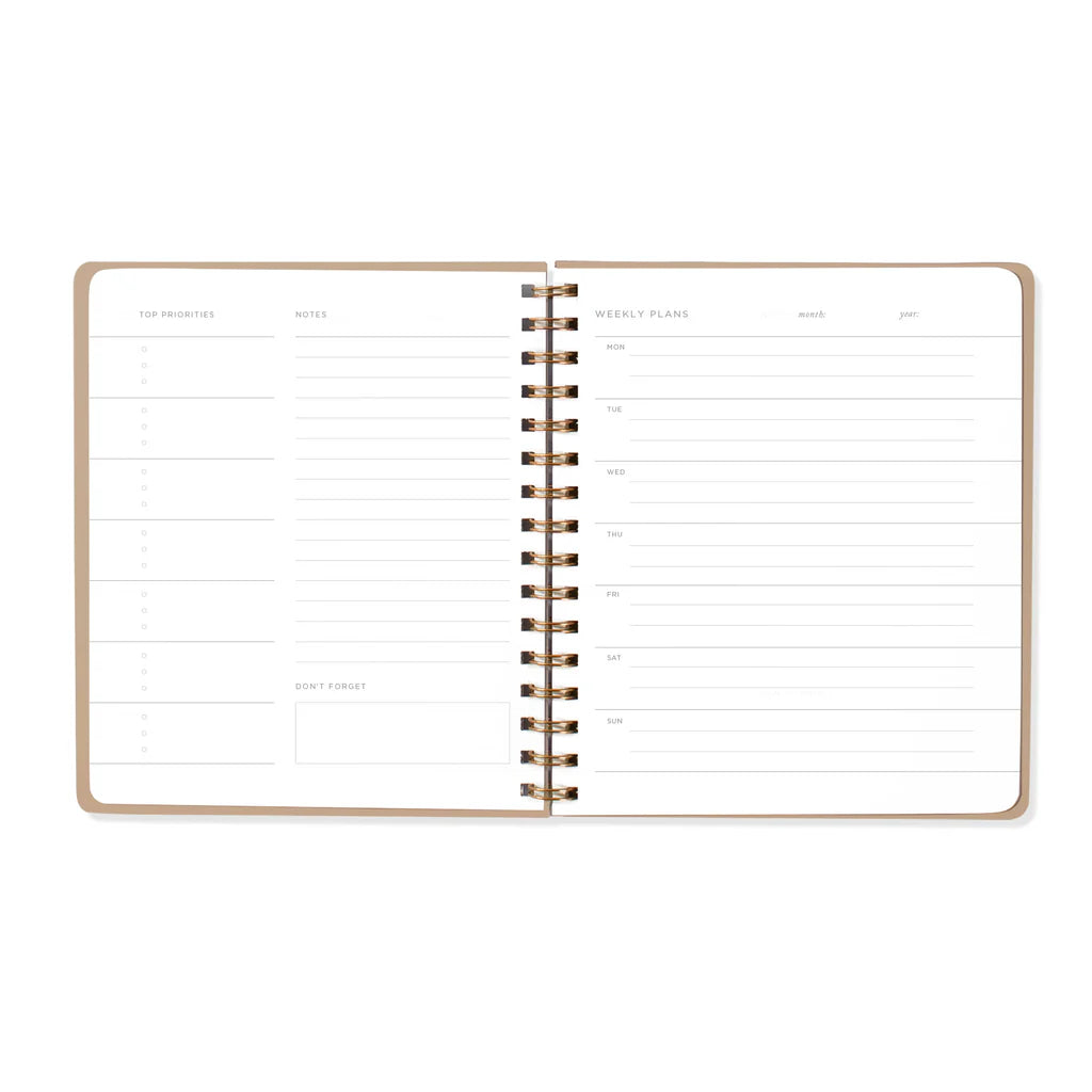 This non-dated weekly planner features a textured paper cover illustrated with exclusive artwork by Juliana Tipton, metallic gold foil accent, weekly prompted pages, and twin-ring spiral binding.
