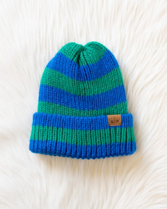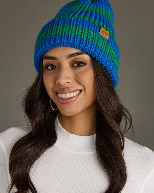 Stay cozy and warm all season in this chic striped beanie. With a rich cobalt and emerald green striped pattern this toque adds colour, print, and fun to any look. Also available in a pink and red colourway.