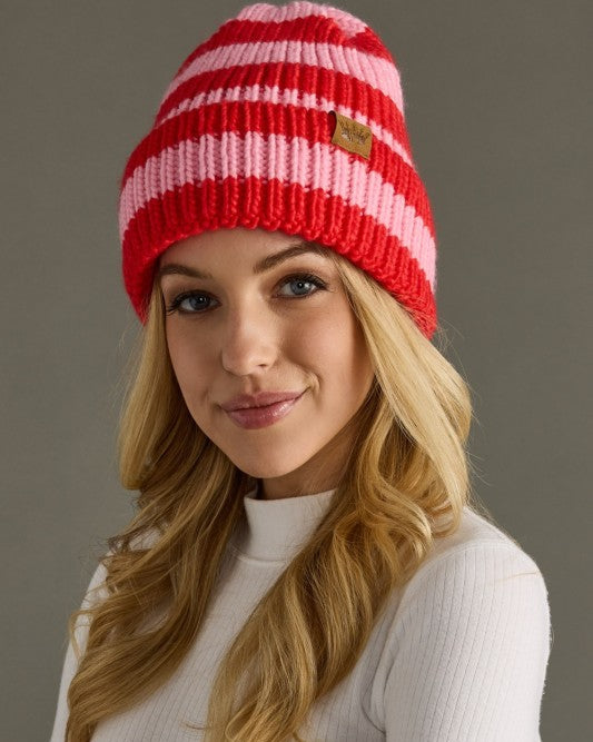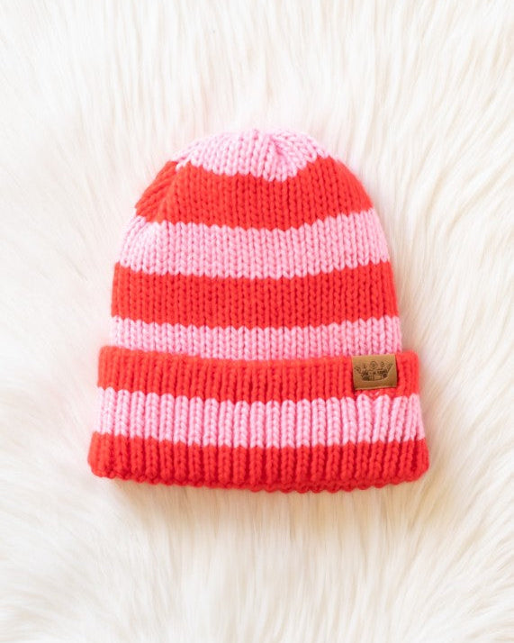 Blush + Red Knit Striped Beanie