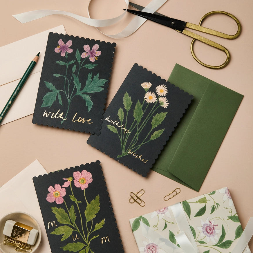 A new addition to the Flora collection, this inky black card has taken inspiration from vintage botanical drawings. It features a die cut scalloped edge, beautiful floral illustration and golden foil on the front and back of the card. It's paired with a luxury blush pink envelope.