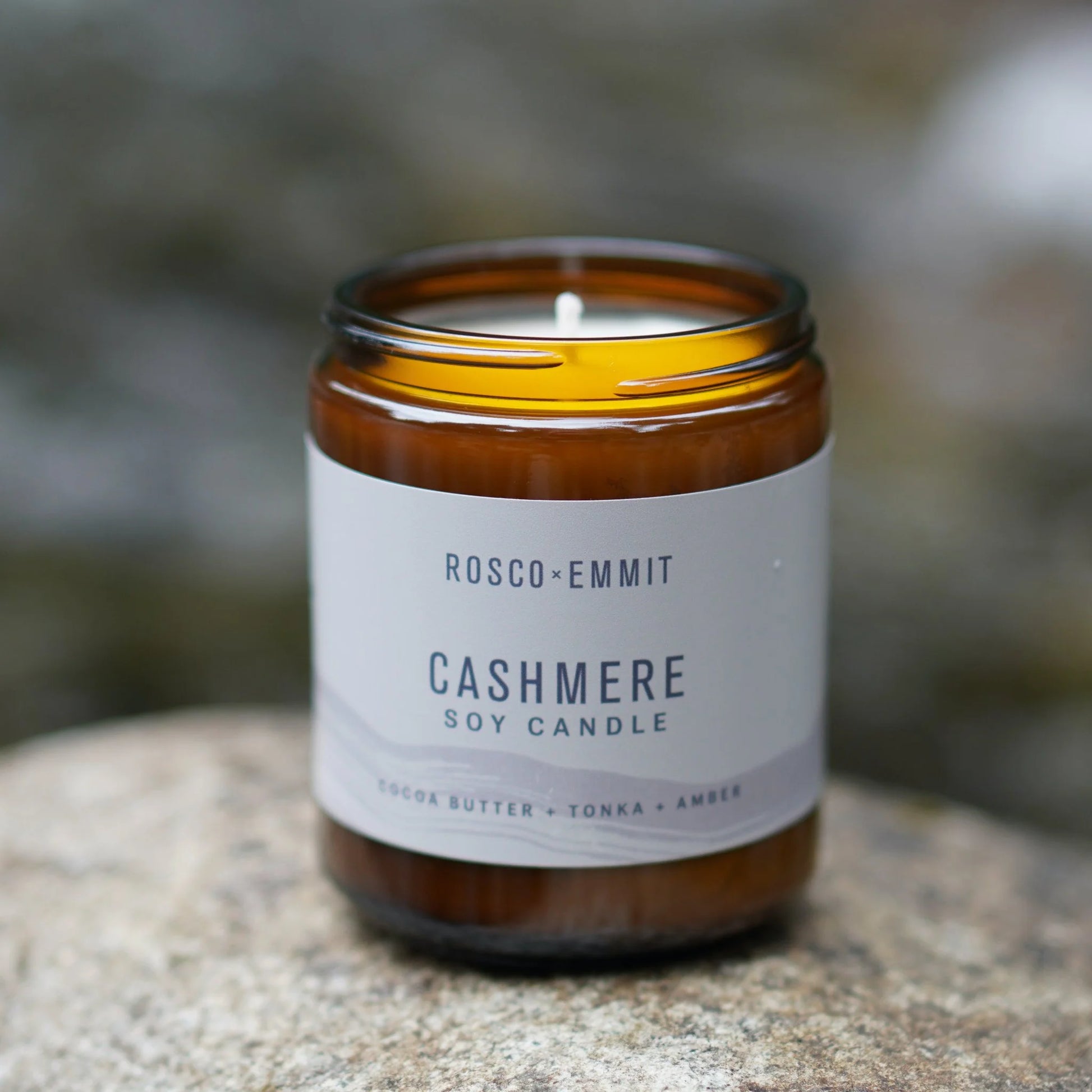 Rosco Emmit's Cashmere soy candle is a cozy blend of Cocoa Butter, Vanilla and Tonka. This is a lighter, brighter Vanilla candle that smells like Cocoa Butter and Marshmallows.