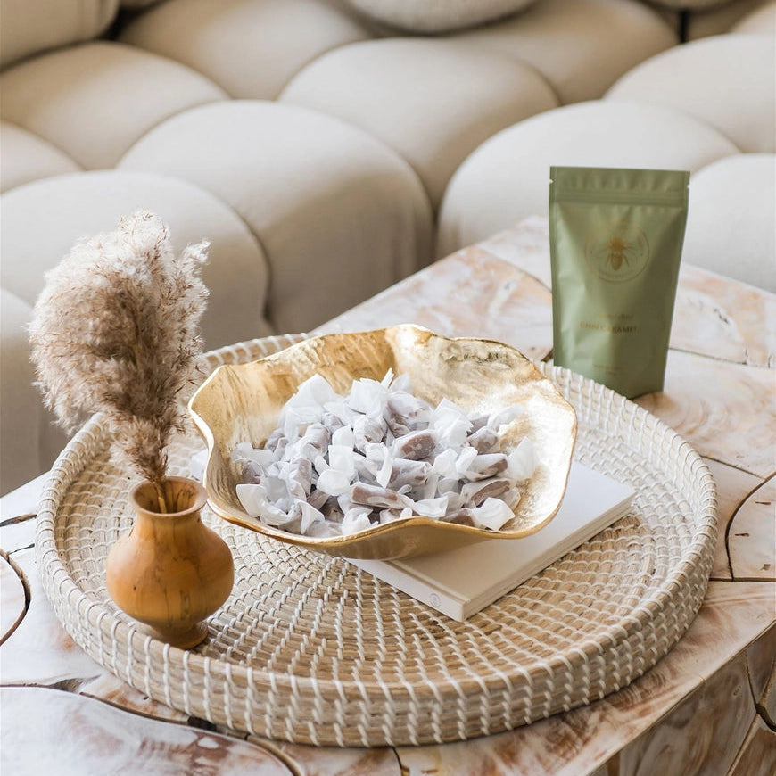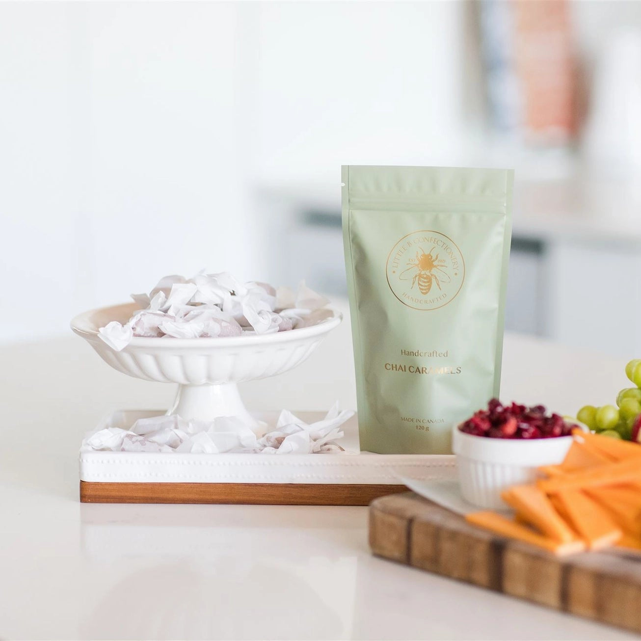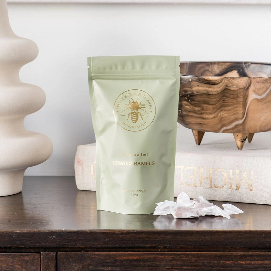 Small batch, hand cut, hand wrapped caramels infused with Assam Black Tea, Cardamom, clove, cinnamon, ginger and black pepper. The spices are hand muddled for the freshest and most authentic taste. A soft and chewy caramel that won't stick to your teeth!