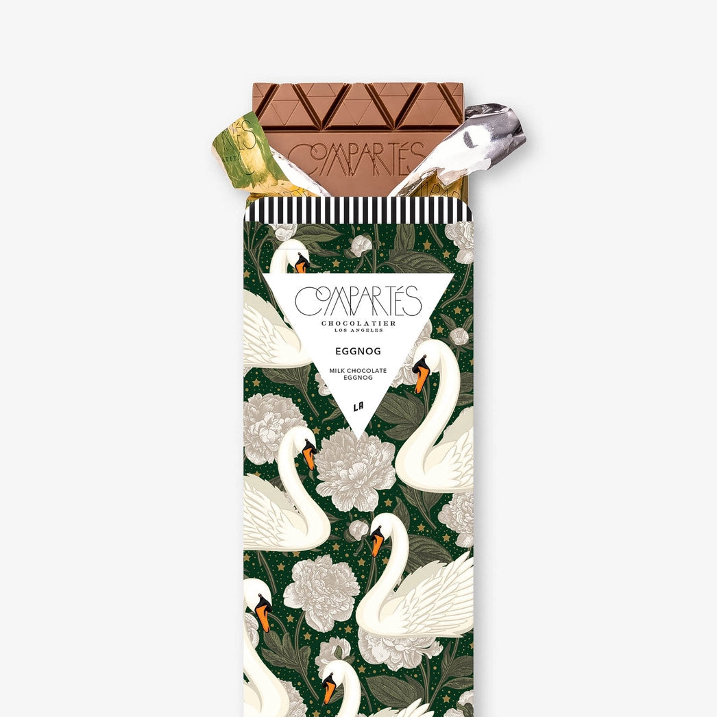 Eggnog is a winter classic delight but it reaches gourmet status when infused into chocolate! Delicious homemade eggnog is laced and infused throughout silky crowd pleasing milk chocolate. Featuring sophisticated and ultra luxe packaging, this Eggnog bar with swan lake motif is a festive holiday gift and treat your customers will be sure to delight in!