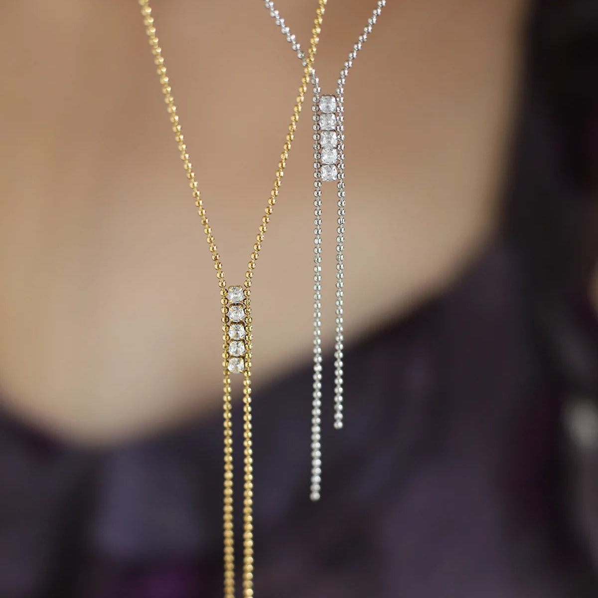 Dazzle this holiday season! This delicate chain necklace features a line of small crystals and contemporary y-shaped design. A beautifully understated piece, the casual leaning ball chain is contrasted by the rectangular shape of the crystal detail for a piece that feels unexpected yet still glamorous.