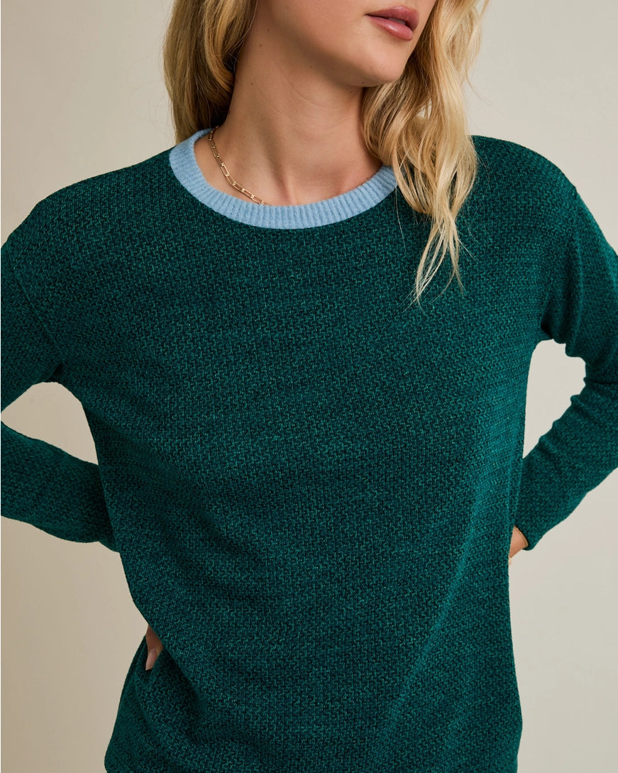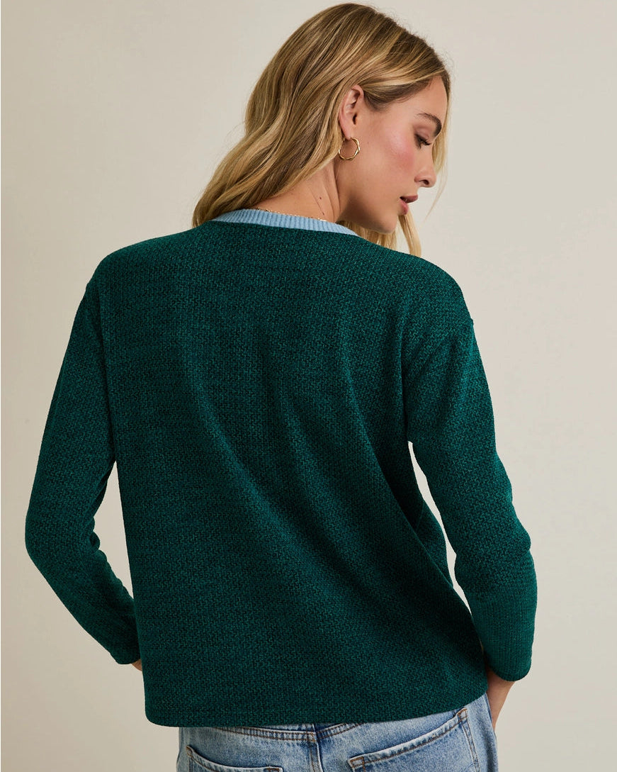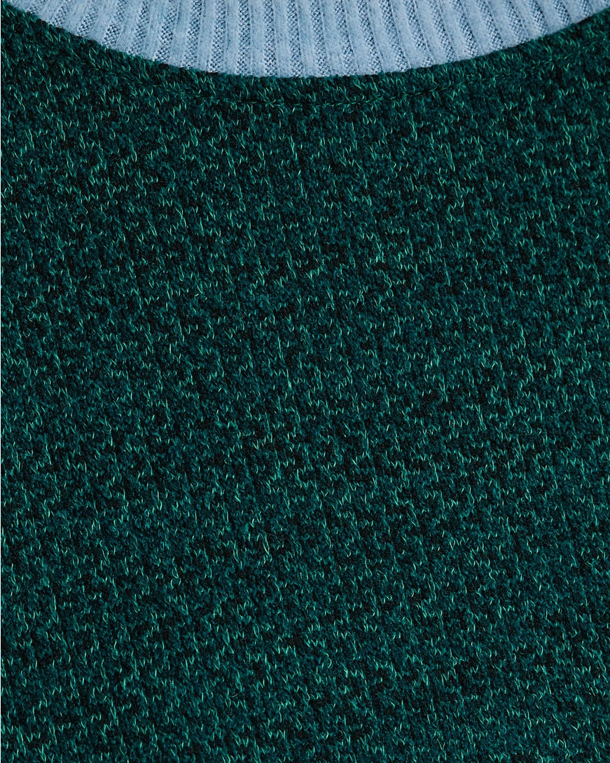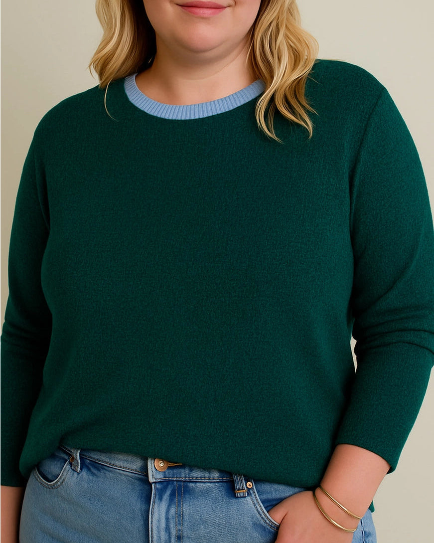 Add colour and pattern to your look in a classic way with this gorgeous deep green sweater with contrasting sky blue neckline. A great layering piece under blazers, sweaters, and jackets, or over blouses and t-shirts, this versatile piece has long sleeves and hits at the hip.