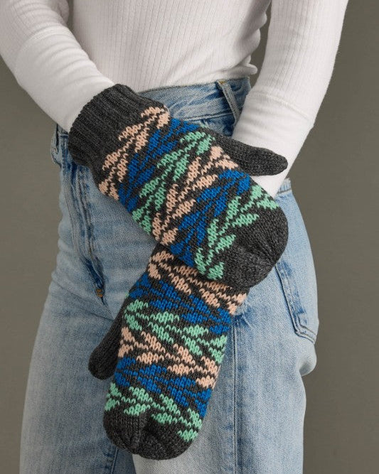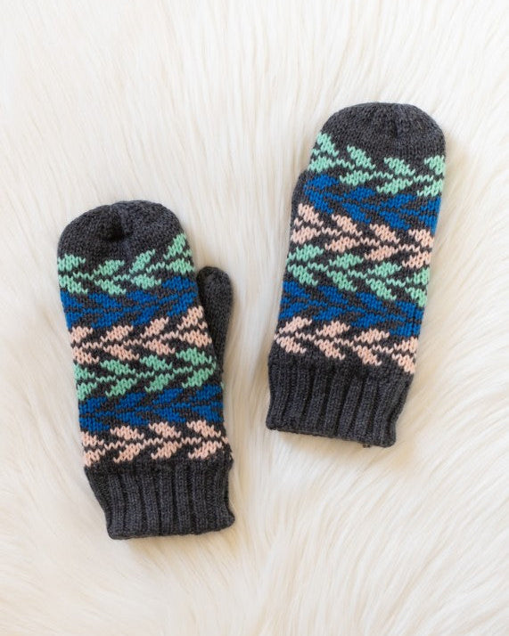 These beautiful knit mittens feature a lovely contrast of blue, green, and pale pink on a grey background. With a strong vintage influence, these fully lined mittens will keep you chic and cozy all season long!