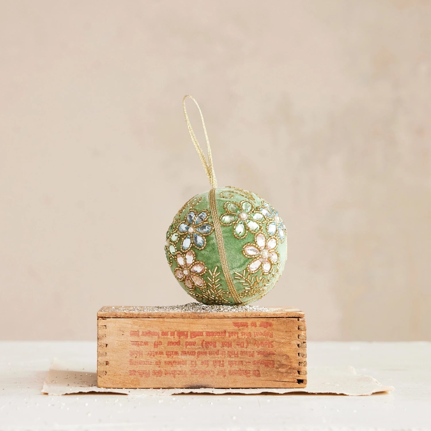 The crowning jewel on any tree, this stunning velvet ball ornament is adorned with gold hand-embroidered details that swirl among jewel and pearl encrusted flowers. Reminiscent of a faberge egg, this ornament is a truly special piece.