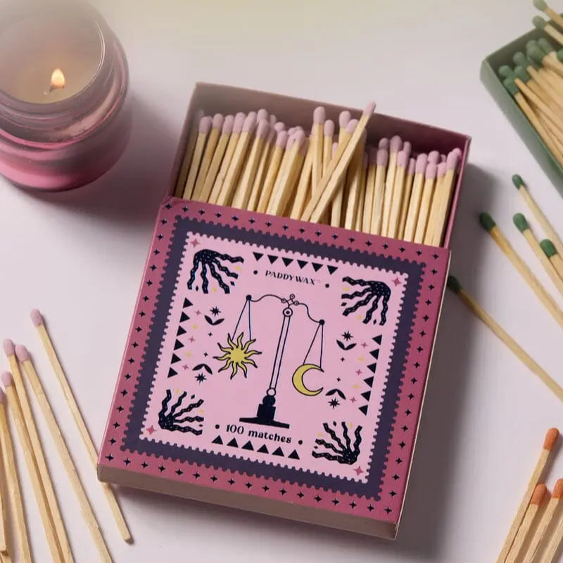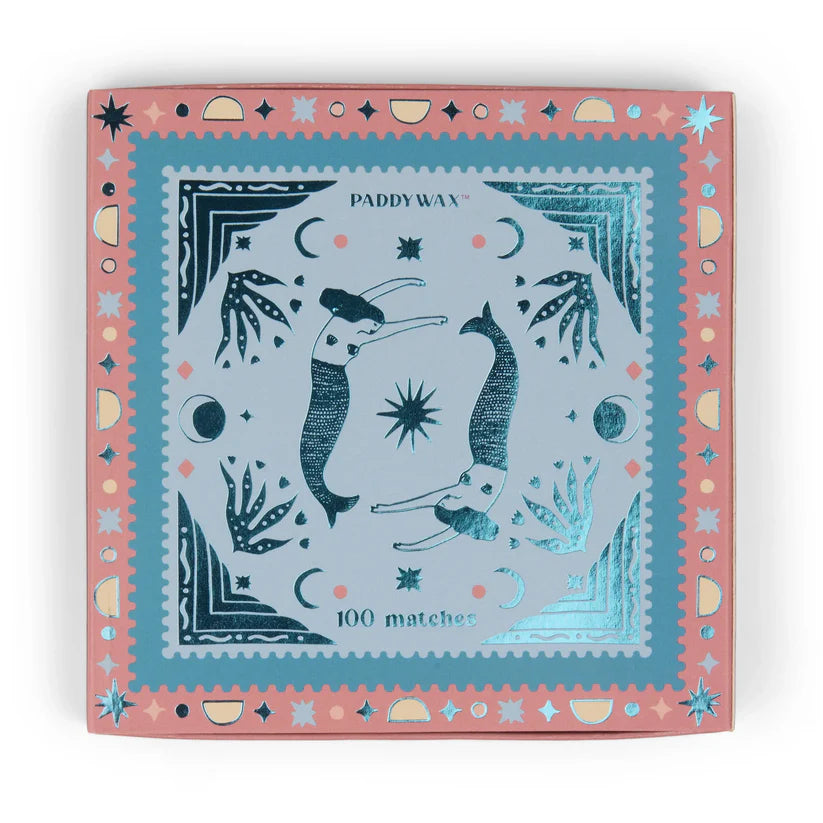 Every candle has its match. These sets of 100 matches come in a hand illustrated work of art matchbox. Each box features metallic or glossy accents, two strikers, and all 100 match tips are colored to match the design. Jumbo matches are a perfect accessory to gift with any Paddywax candle.