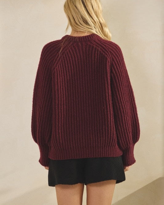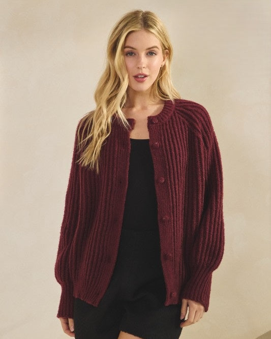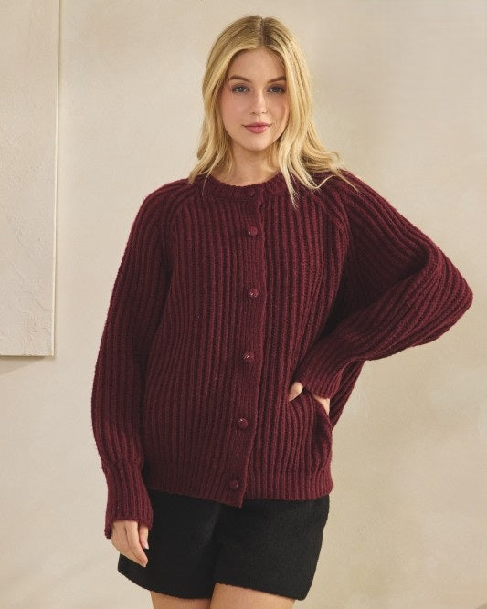 Stay cozy this season with this plush knit cardigan in a gorgeous deep maroon hue. With a crew collar and button front this is an everyday staple. Hitting at the hip, this slightly oversized design is an easywearing piece perfect for cooler temperatures.