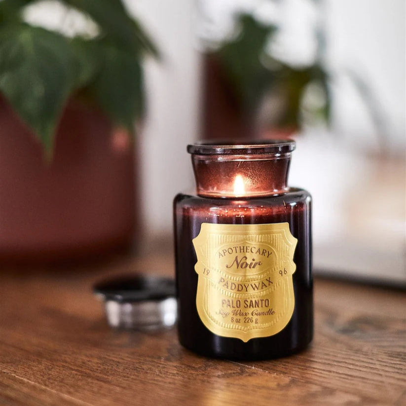 It's Apothecary...with an edge. Apothecary Noir is a sophisticated take on Paddywax's best-selling apothecary candle line. Featuring the same iconic shape of an old world apothecary bottle, Noir brings an extra does of decadence with inky black tinted glass and embossed metallic labels. Every Paddywax Candle is made with a clean-burning soy wax blend, alluring fragrance oils, and 100% cotton wicks, ensuring safe and long-lasting fragrances for your space.