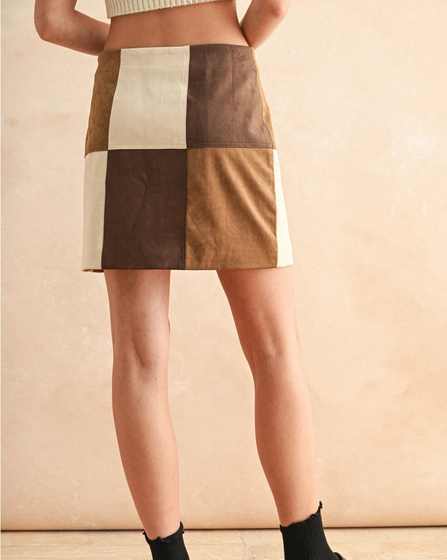 Turn heads all seasons in this retro inspired skirt with patchwork style rectangles in neutral tones. An easy piece to style throughout the season with tights, boots, chunky sweaters, or thigh grazing jackets.