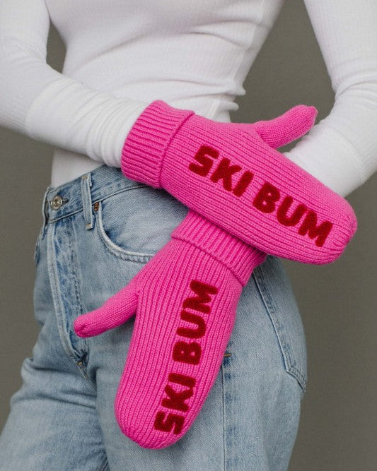 Add a pop of colour to your look - and make it easy for your ski buddies to find you on the mountain! These vibrant pink knit mittens feature large red "Ski Bum" embroidery for a cheeky vibe.