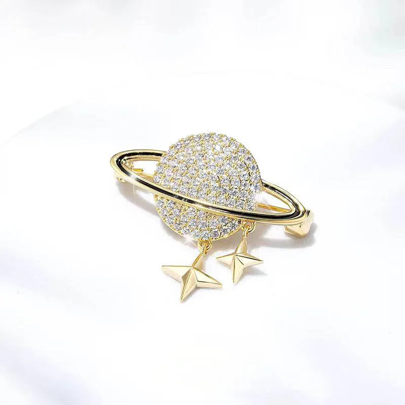 Embrace a vintage look with this crystal encrusted planet brooch with dangling stars detail. A fun accessory for any look, this brooch would be stunning on a thrifted blazer lapel, or add some sparkle to your handbag, blouse, dress, or anywhere else a pin can go!