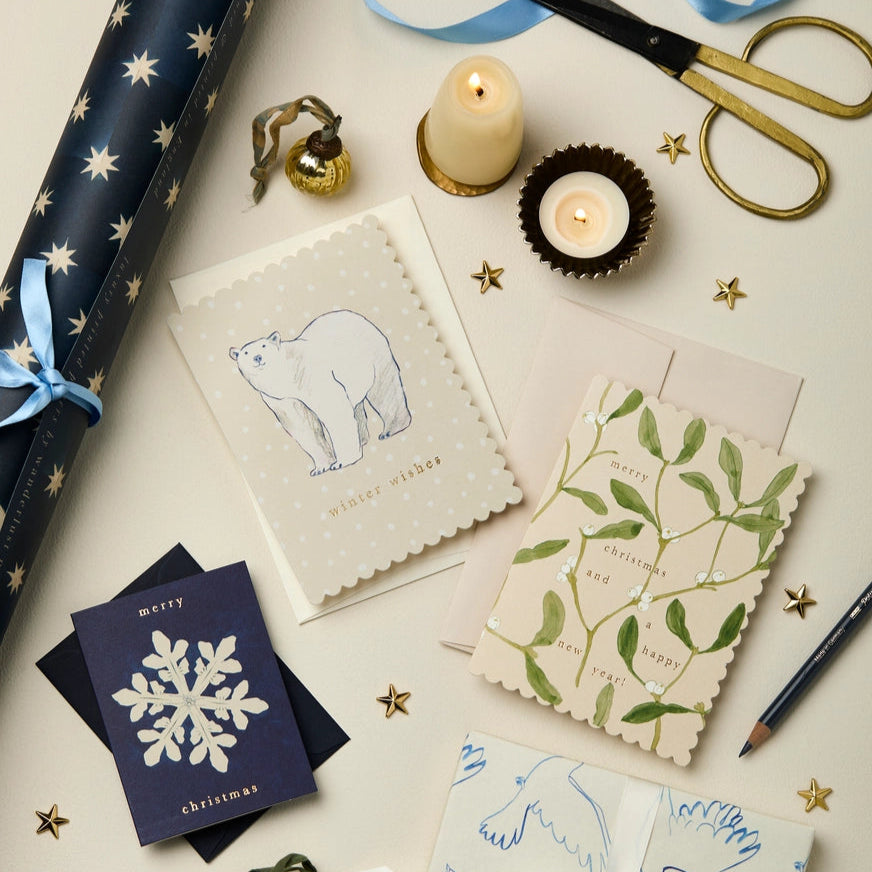 This adorable polar bear design features a die cut scalloped edge, monochrome colour palette and golden foil on the front and back of the card. Each card is paired with a luxury cream envelope.