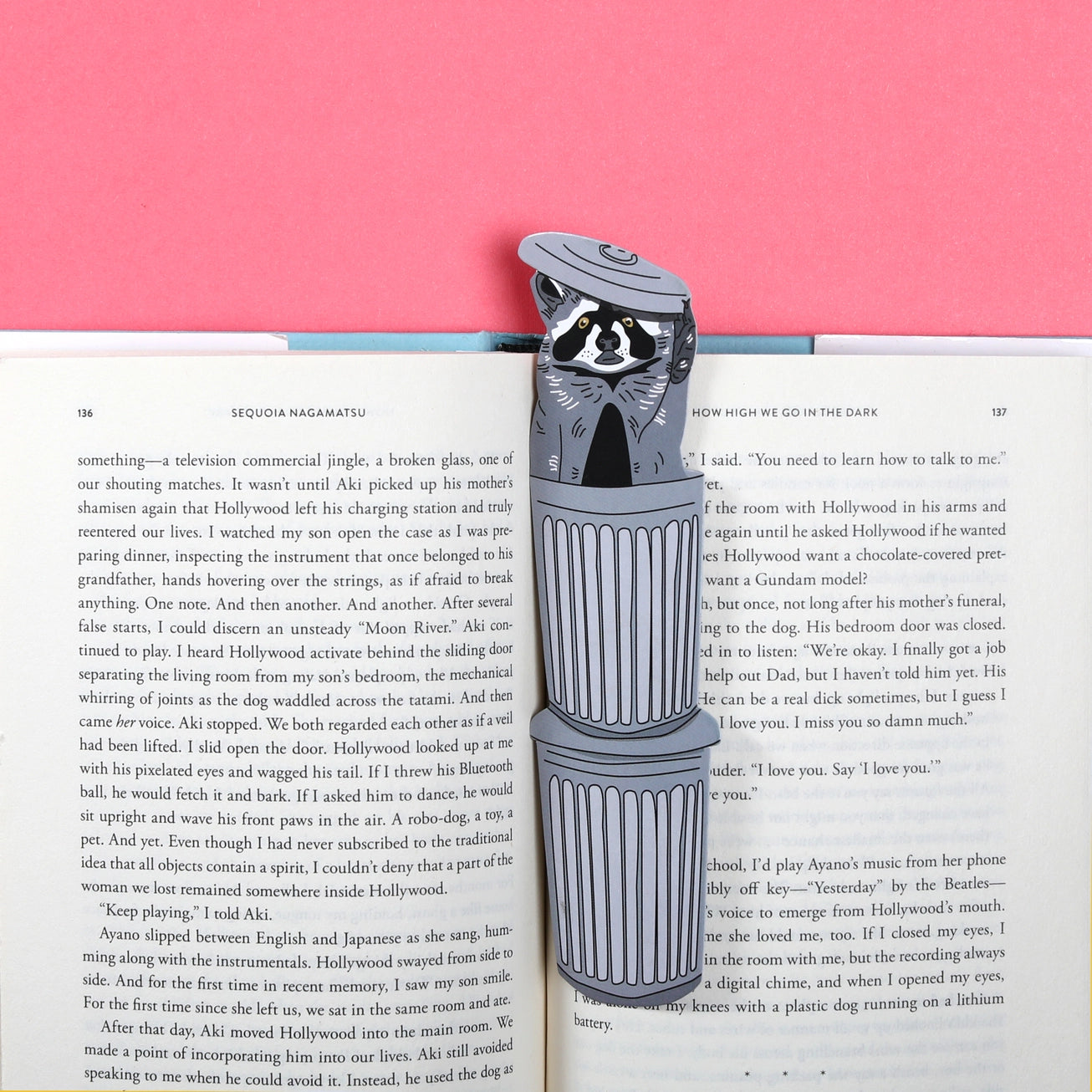 It's a raccoon in a trash can in a book! Bookmarks are underrated... until you have a trash panda sticking out of your very serious non fiction book.
