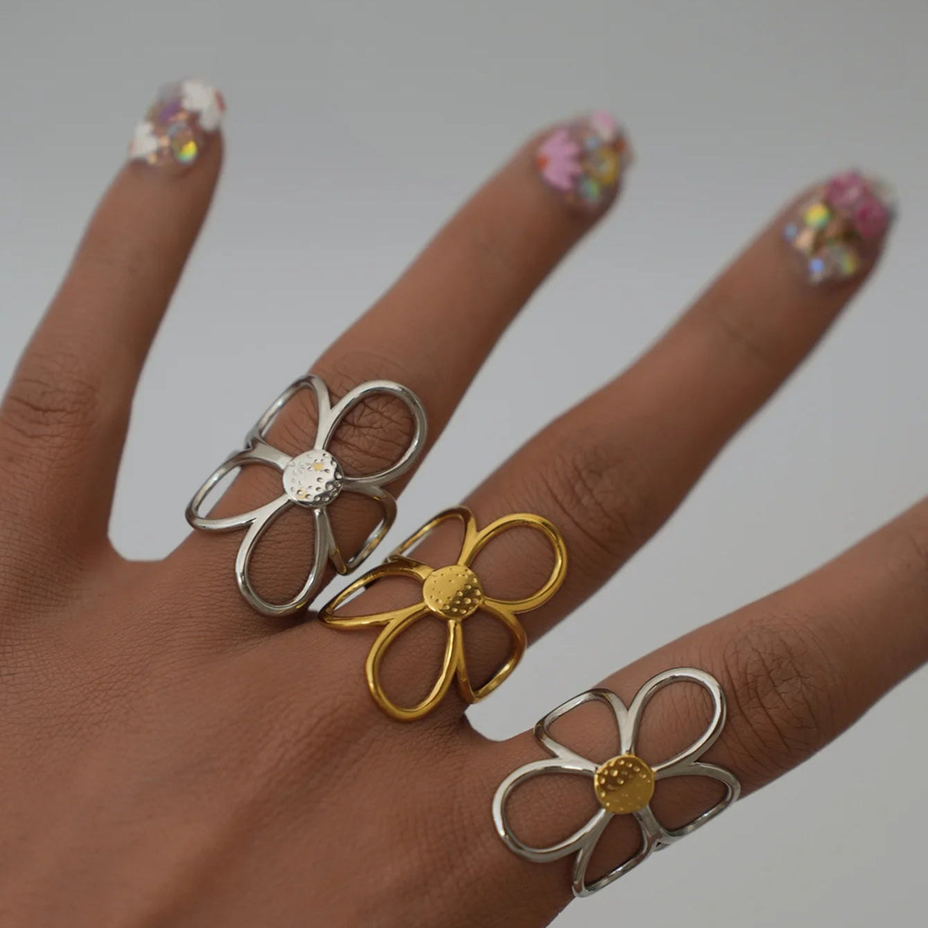 Add a casual and effortless vibe to your look with this oversized gold plated flower ring. With an open back this ring is adjustable while being both playful and feminine.