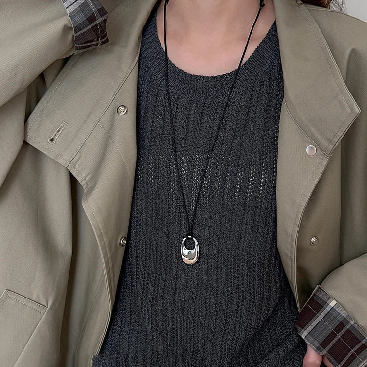 Sleek and modern with a clear nod to Y2K styles this necklace features an organic oval-shaped silver pendant on natural black cording. This long style is a refreshing addition to any wardrobe.