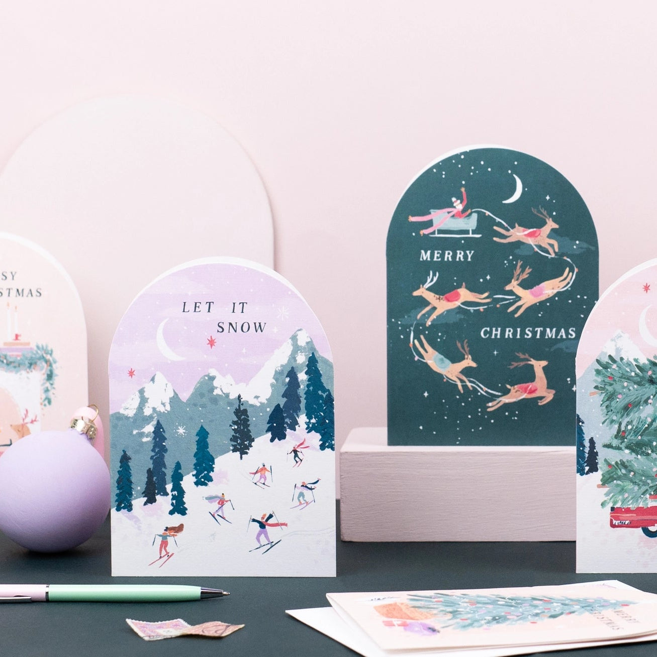 This beautiful Christmas card features an arched shape and illustrated skiers on a snowy mountain, alongside a festive greeting to “Let it Snow”.