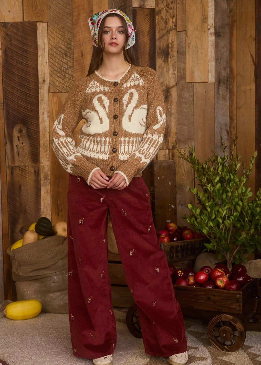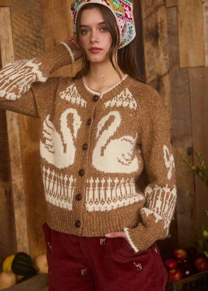 Basics are fine and dandy but sometimes don't you just want a swan print knit cardigan? The bold swan knit pattern is offset with a neutral rust and cream colour combination and the sweater has a vintage, handmade feel thanks to the button front and cuff details. An unexpected piece to shake up your look!