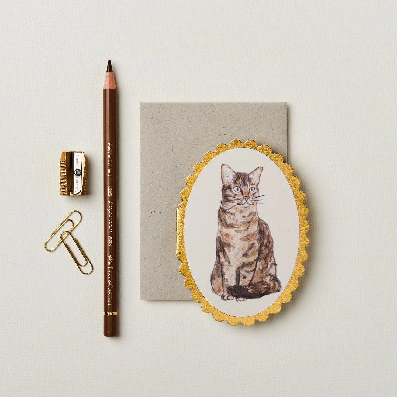 A mini oval-shaped card featuring playful illustrations with gold foil scalloped edges. Each one is paired with a recycled grey flecked C7 envelope.