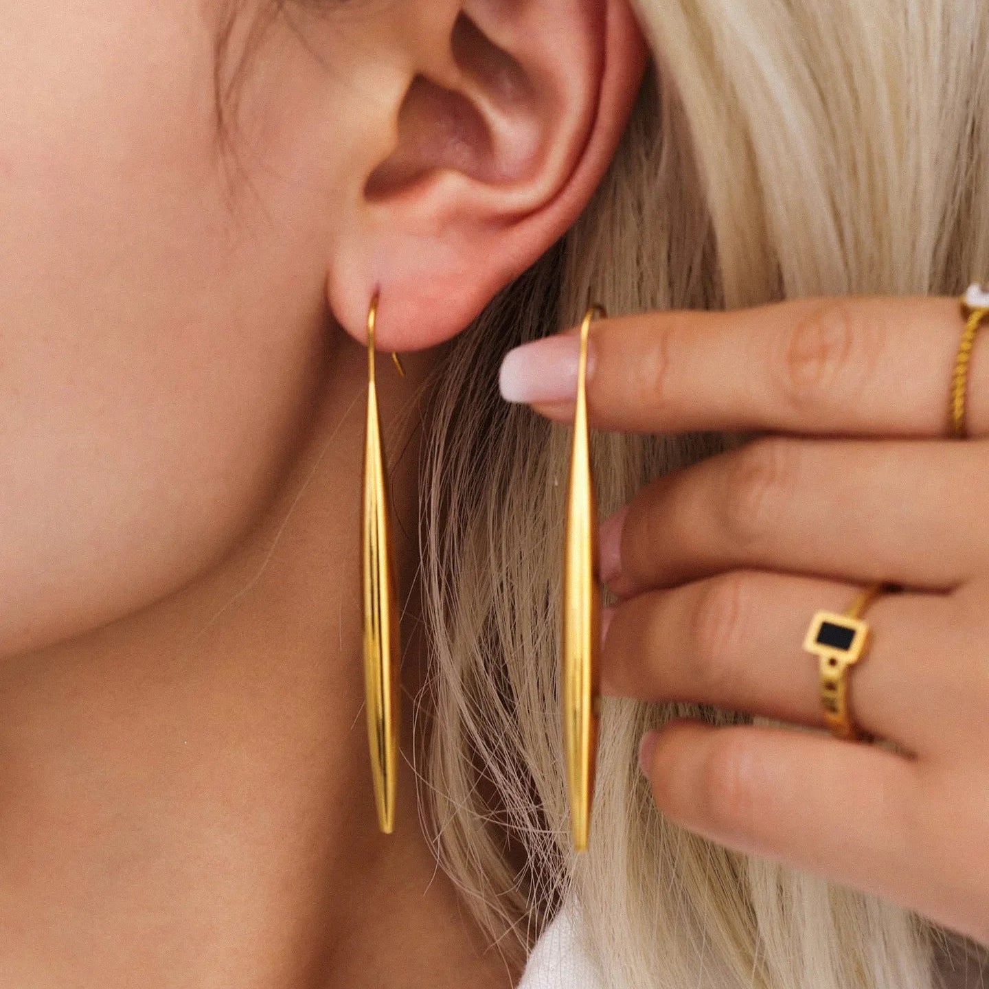 Dazzle this holiday season! These modern drop earrings feature a continuous form from earring hook to tip, creating a sleek and contemporary look. With an elongated form reminiscent of icicle Christmas tree ornaments we love the unexpected combination of innovation and nostalgia. Available in gold or silver.