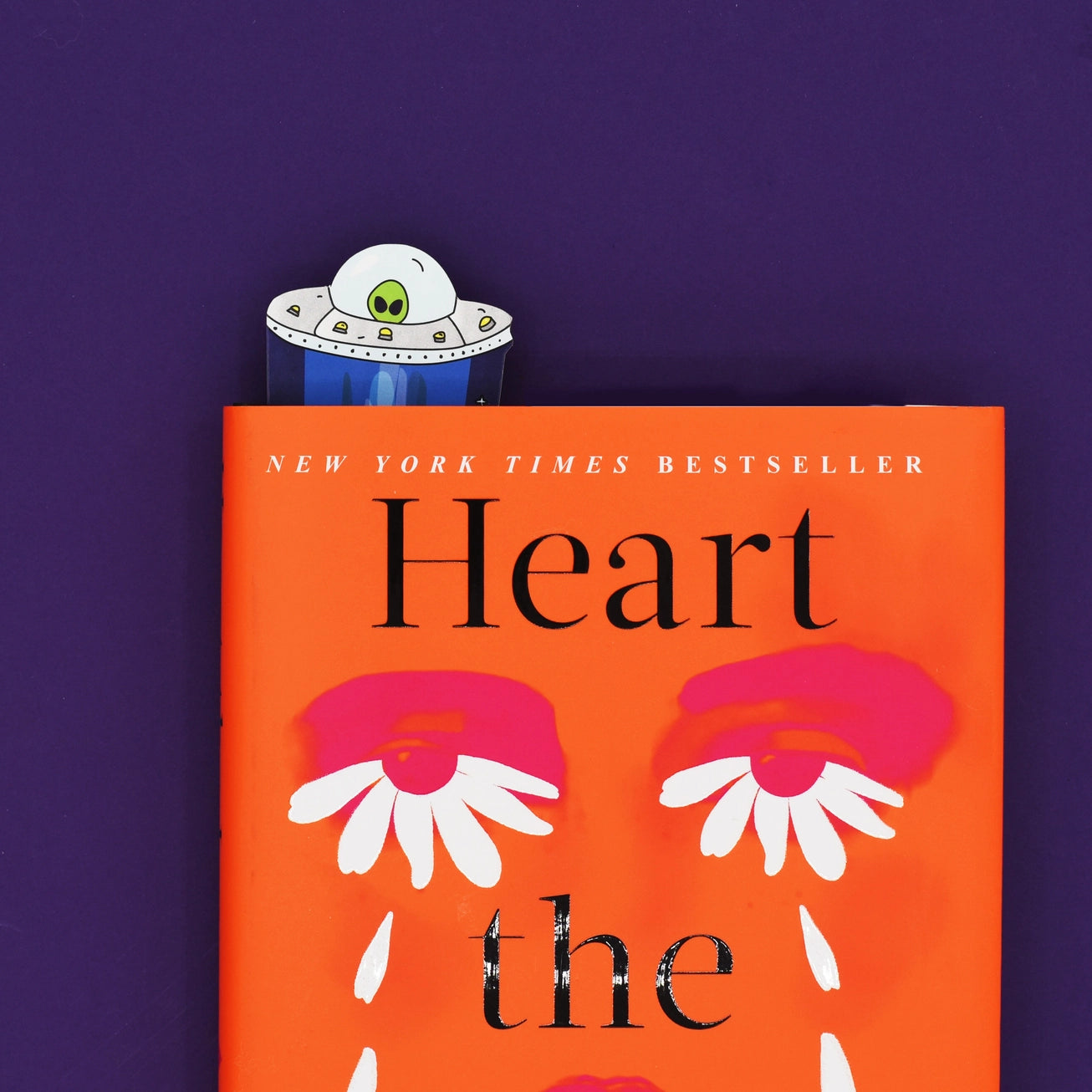 It's a UFO in a book! Bookmarks are underrated... until you have a funny little alien in a UFO hovering over your pages.