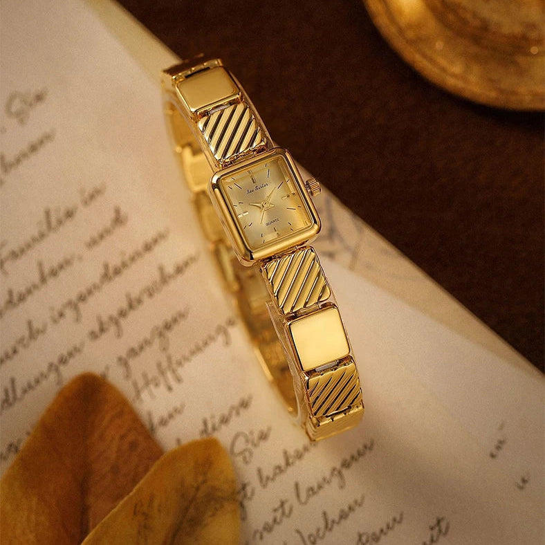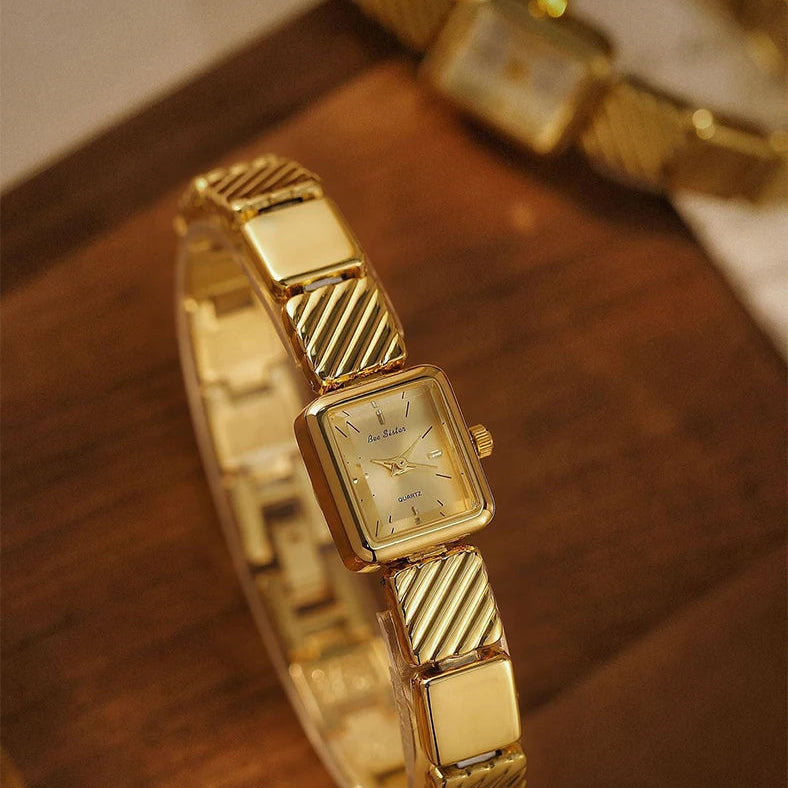 A classic wrist watch is a true staple piece in your jewellery collection. Meet Victoria. You won't lose track of time with this vintage inspired gold framed watch. The unique interlocking band and small watch face give this piece a bracelet feel. Delicate yet statement making, this watch has an heirloom quality that adds interest to any look.